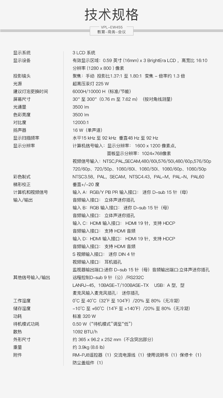 商品名称:索尼(SONY)VPL-EW455 投影仪 投影机办公(高清WXGA 3500流明 HDMI高清接口)