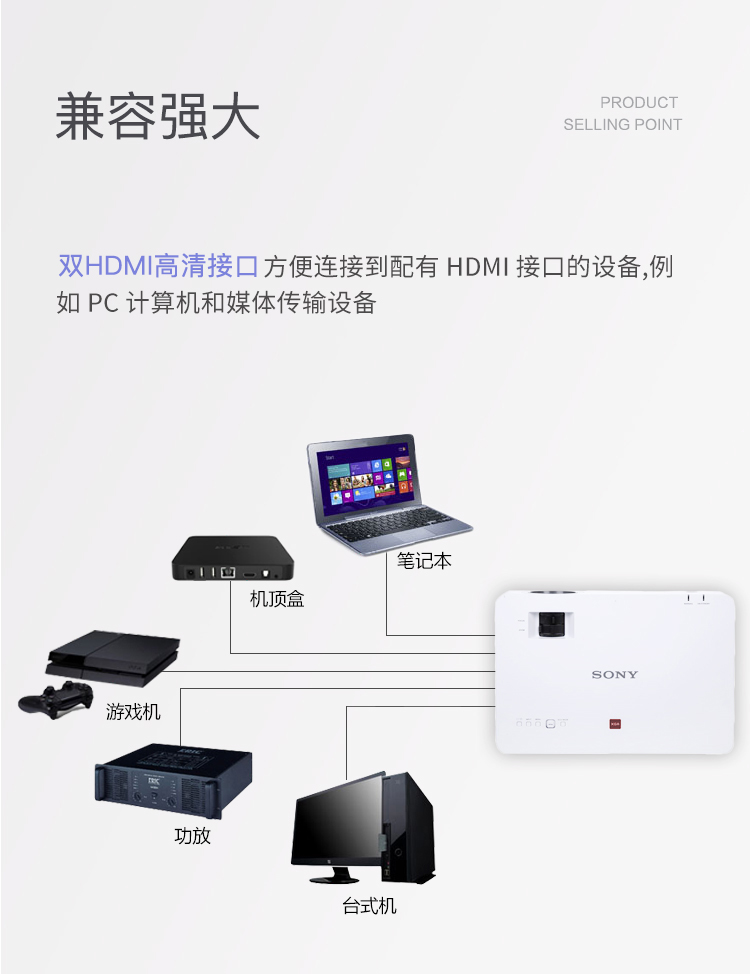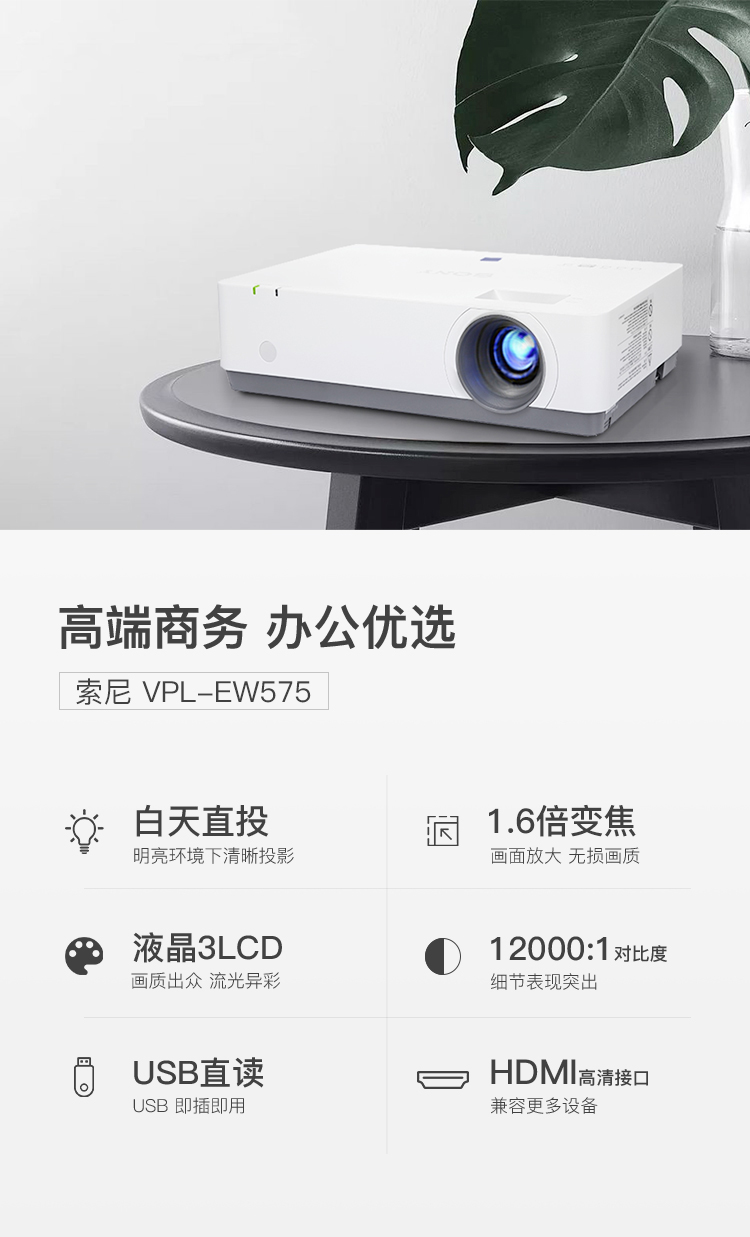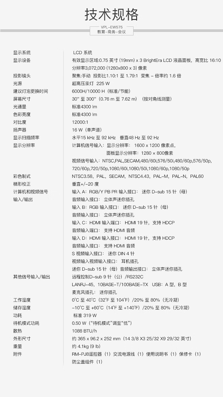 商品名称:索尼(SONY)VPL-EW575 投影仪 商务办公投影机 (高清WXGA 4300流明 双HDMI接口 16W扬声器)