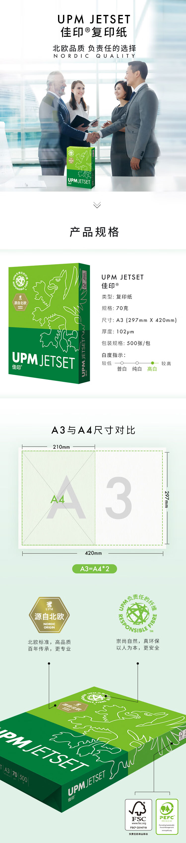 商品名称:UPM 佳印 70g A3打印纸 复印纸 FSC认证 500张/包 5包/箱(2500张)