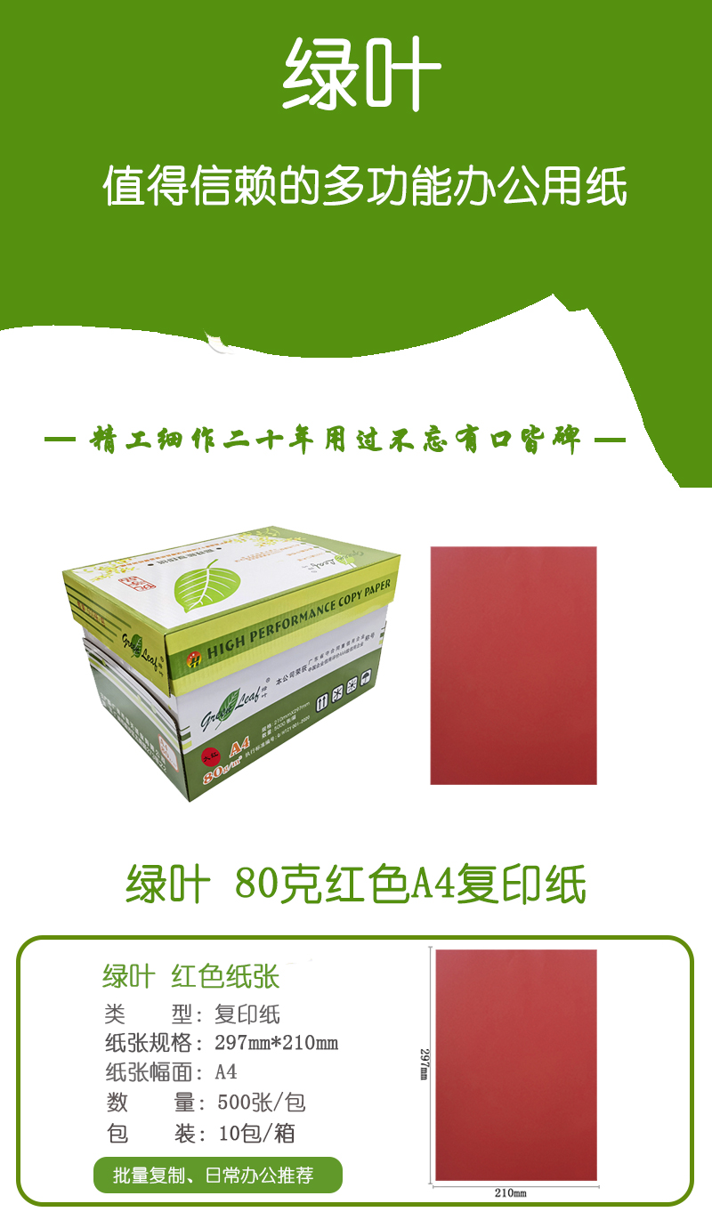商品名称:绿叶(green leaf)80克A4 红色复印纸 500张/包 10包/箱 单价 元/包
