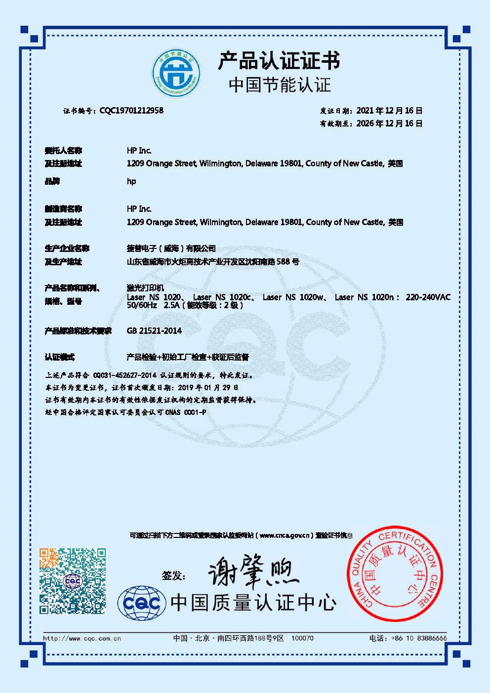 • 认证型号:NS 1020c