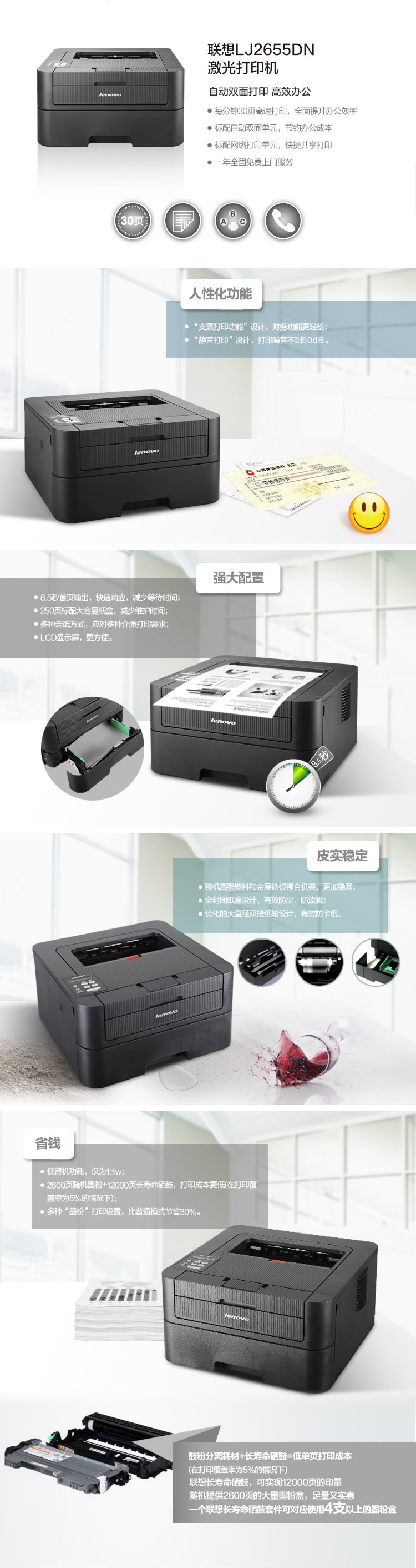 商品名称:联想(Lenovo)LJ2655DN A4黑白激光打印机 自动双面打印