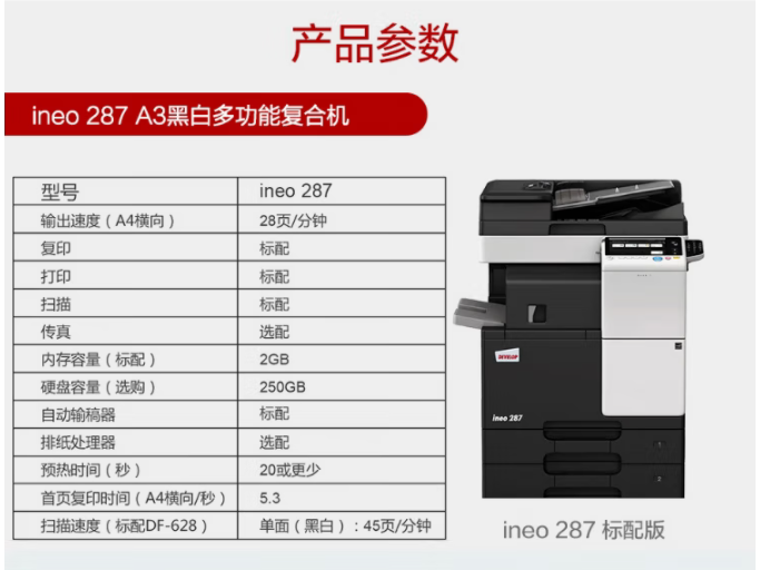 商品名称:德凡 复合机 ineo 287 A3黑白多功能复合机标配 (双面输稿器+双500页纸盒+100页手进托盘)