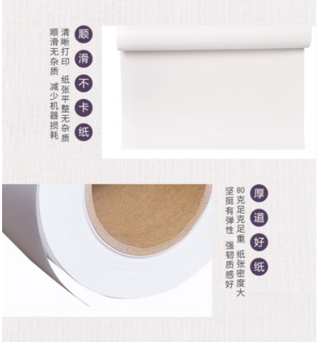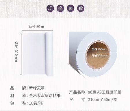 商品名称:天章 工程纸 白色A3绘图纸 卷式加厚复印打印纸 数码纸机械设计CAD制图 80g 2寸芯 310mm*50m/卷 10卷/箱