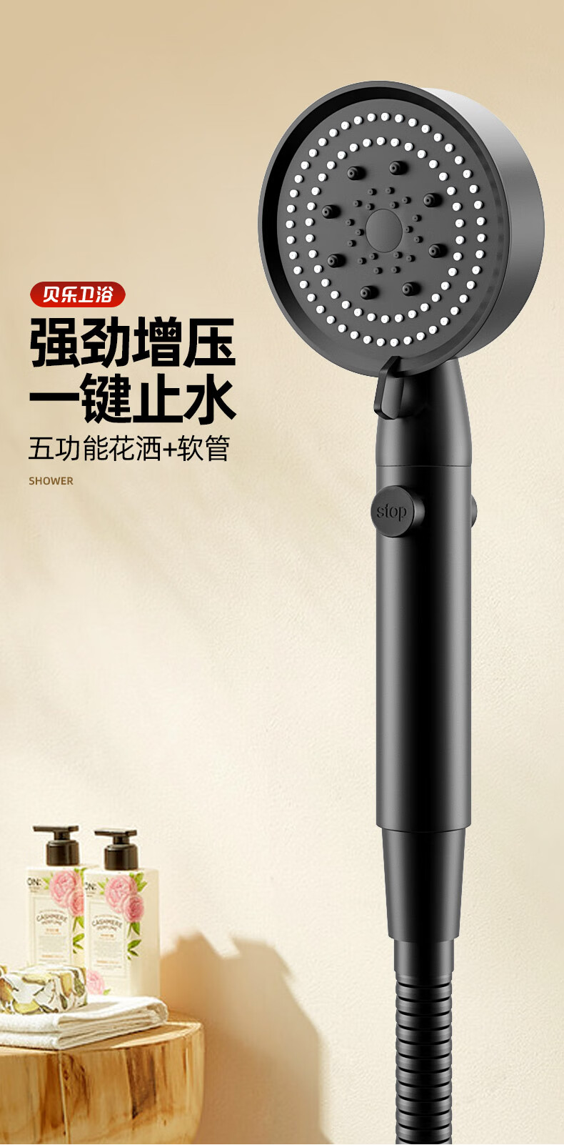 贝乐 手持黑色增压花洒头喷头DS10632+1.5米黑色软管两件套 加压浴室洗澡莲蓬头淋浴头