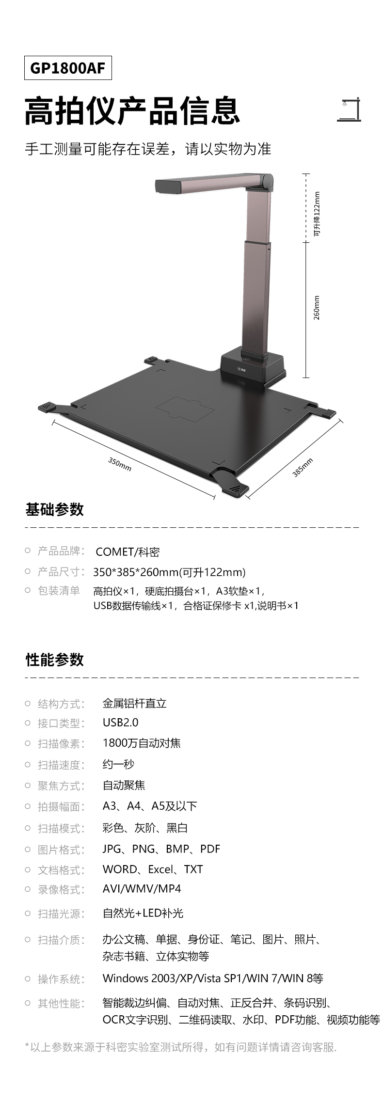 商品名称:科密 高拍仪 1800万高清像素 A3A4扫描仪 网课文件合同 OCR文字识别 支持国产系统 GP1800AF
