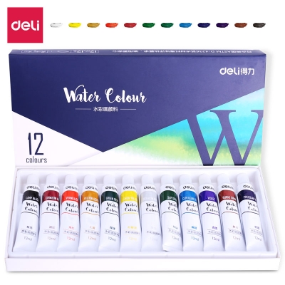 得力(deli)水彩颜料 12色12ml 大容量画画美术专用 便携专业级学生儿童绘画套装便携工具写生 画具画材73850