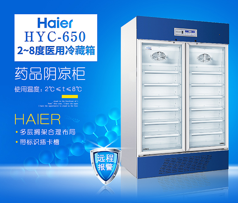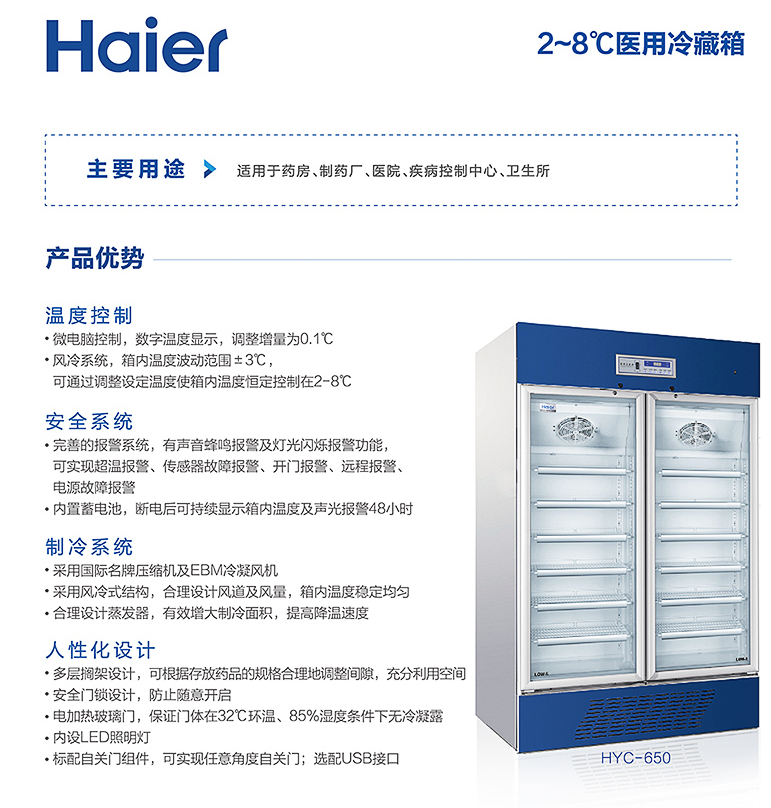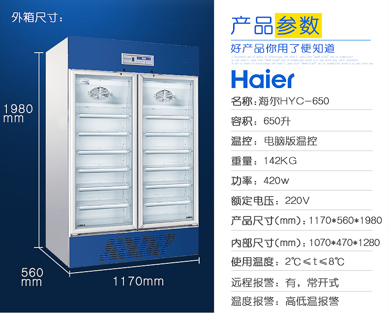 商品名称:Haier/海尔HYC-650 650升冷柜2-8度 医用冰箱 药品冷藏柜双门大容量立式冰柜冰箱 医用冰箱